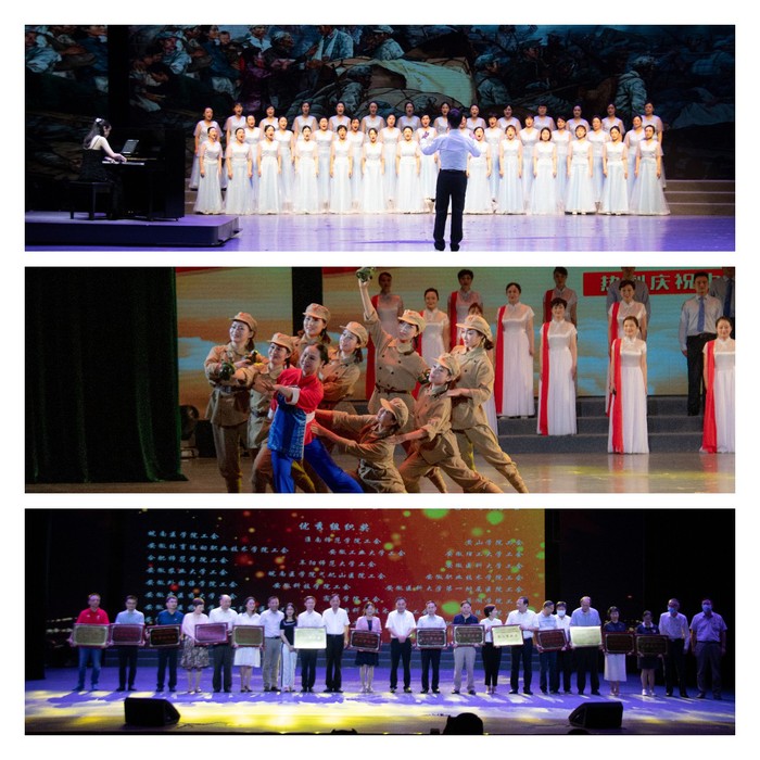 文艺汇演在全体人员合唱《没有共产党就没有新中国》的歌声中圆满落幕。“全国最美思政课教师”“全国先进工作者”、安徽师范大学路丙辉教授参与演出,省教科文卫体工会直属单位部分领导、工会负责人和职工代表出席活动。