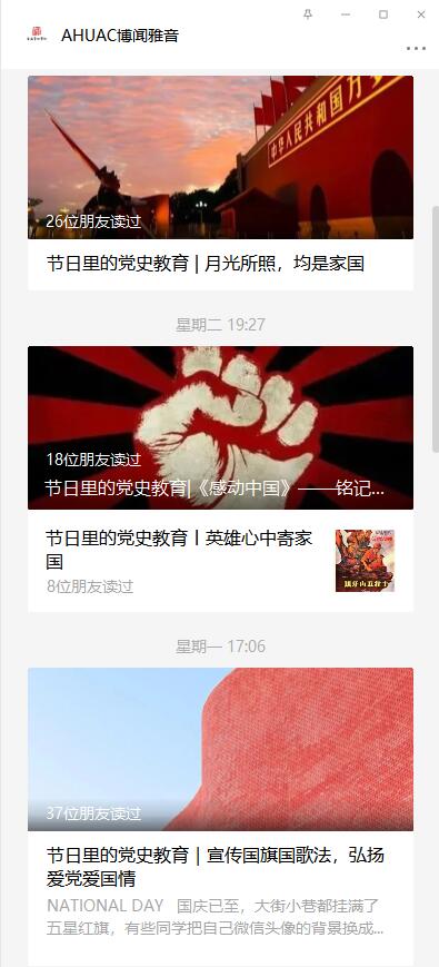 围绕烈士纪念日、国庆节两大节点,学校各二级院系、部门微信公众号联合行动、集中发力,推出“节日里的党史学习教育”专栏,16篇系列推文共同在网络意识形态阵地营造出浓厚的爱党爱国爱社会主义氛围。