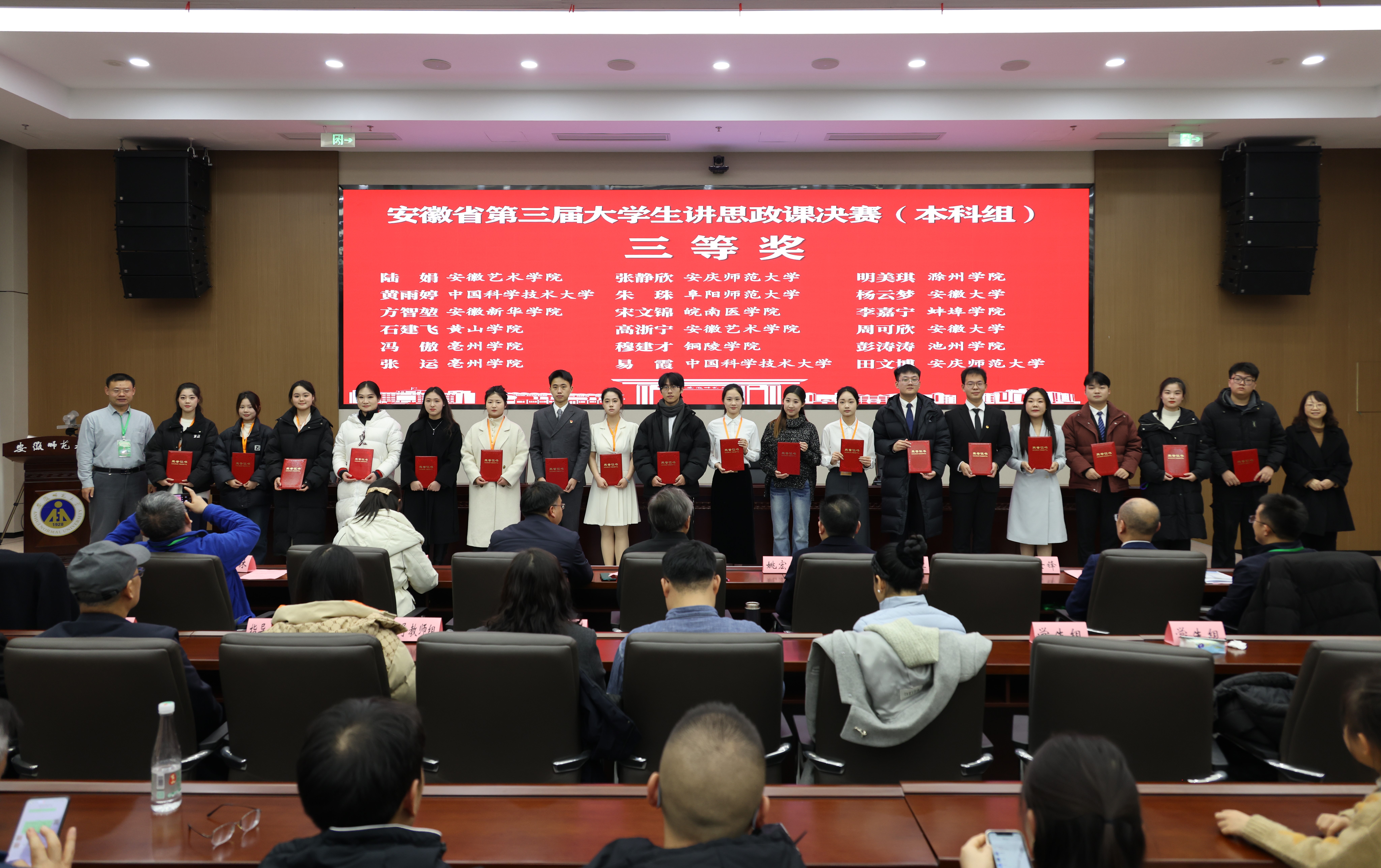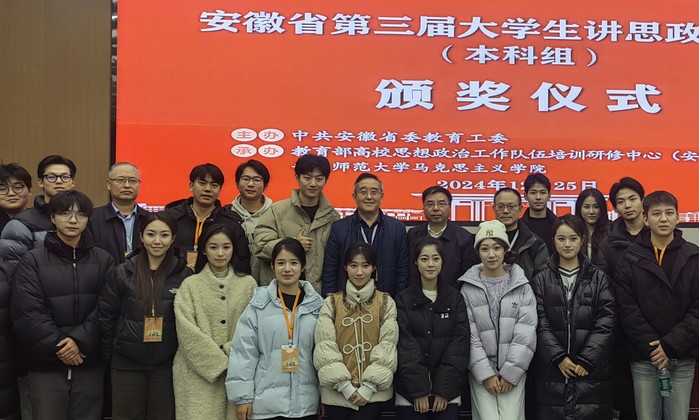 为深入学习贯彻习近平总书记对学校思政课建设作出的重要指示批示精神,全面落实新时代学校思政课建设推进会精神,深化思政课改革创新,着力推进“大思政课”建设,由中共安徽省委教育工委主办,教育部高校思想政治工作队伍培训研修中心(安徽师范大学)、安徽师范大学马克思主义学院承办的安徽省第三届大学生讲思政课决赛12月25日在芜湖举行。我校学子连续第三次在该赛事中获特等奖。