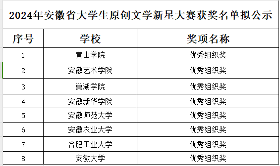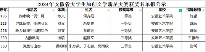 近日,由安徽省教育厅主办,安徽大学承办的2024年安徽省大学生原创文学新星大赛评审结果公示,我校学子在此次大赛中喜获佳绩。
