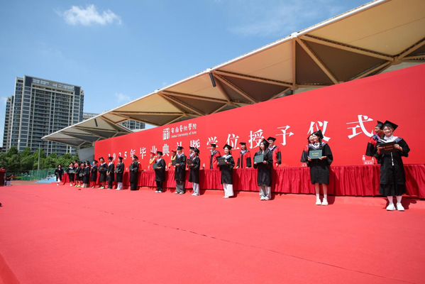 与会校领导为毕业生代表拨正流苏、颁发学位证书。