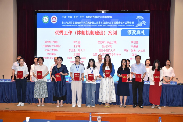 6月27日至28日,长三角高校心理健康学术交流会暨安徽省高校第四届心理健康教育发展论坛在芜湖召开。论坛颁奖会上,我校刘长华、郝驰原撰写的心理工作案例荣获省级优秀工作案例、心理专职教师武琪敏撰写的心理个案荣获省级优秀个案案例,郑鑫和贾方敏两位教师分别获评学工系列和咨询师系列“安徽省先进个人”。