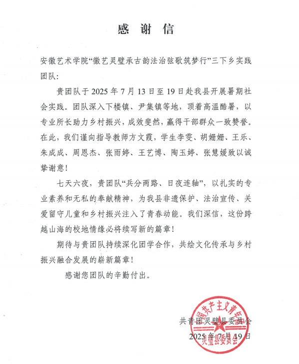 7月19日,共青团灵璧县委员会向我校“徽艺灵璧承古韵 法治弦歌筑梦行”暑期三下乡社会实践团队发来感谢信,对团队在非遗文化保护、法治宣传教育、留守儿童关爱及乡村振兴等方面作出的积极贡献表示感谢。