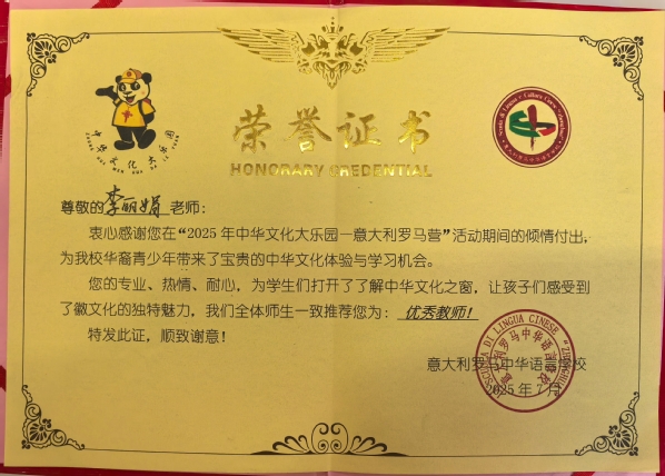 两位教师专业能力突出、教学经验丰富,充分发挥自身所长,将中华优秀传统艺术的美学精神、技艺特征与文化内涵深度融合,向海外华裔青少年展现了中华文化的独特魅力,为此,意大利罗马中华语言学校全体师生特别推荐李丽娟、张钰浩为优秀教师。
