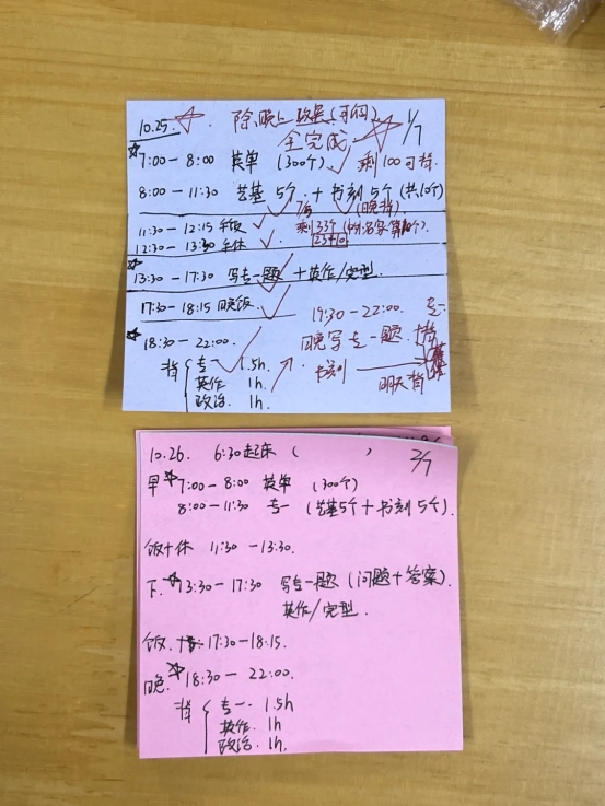备考期间,外界的干扰与他人的进度难免令人焦虑,但我始终提醒自己:专注脚下的路,按部就班完成每日计划,不被他人的节奏打乱阵脚。这种“稳扎稳打”的信念,让我在漫长的备考周期中保持定力,最终迎来破茧成蝶的时刻。我将大目标拆解为周计划、日任务,