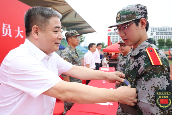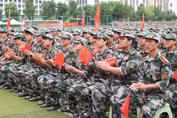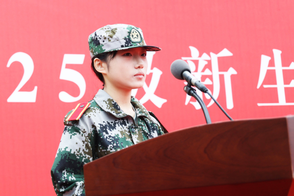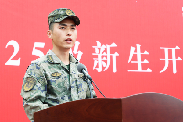 军训教官代表时英圆在军训动员讲话中指出,军训旨在激发大学生爱国热情,增强国防观念与组织纪律性,锤炼顽强拼搏、吃苦耐劳的意志品质,培养团结协作、令行禁止的集体主义精神。他激励2025级新生以“准军人”标准严格要求自己,用汗水书写青春,用意志铸就辉煌,充分展现当代青年学子奋发向上的精神风貌。同时,他代表承训部队郑重承诺,将做到科学组训、精心施教,以身作则、模范带头,文明带兵、确保安全。