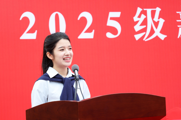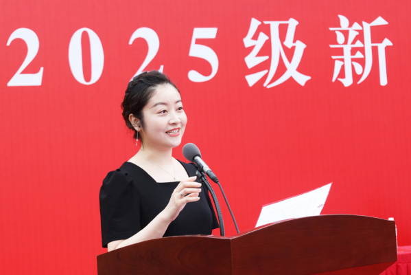 教师代表、2025年“最美教师”何梦婷为新生送上诚挚赠言。她鼓励新生在当下“算法”主导的时代,勇敢探索大学生活的无限可能,大胆走出舒适区,积极尝试新事物,做清醒的求知者,成为善于思考的人。