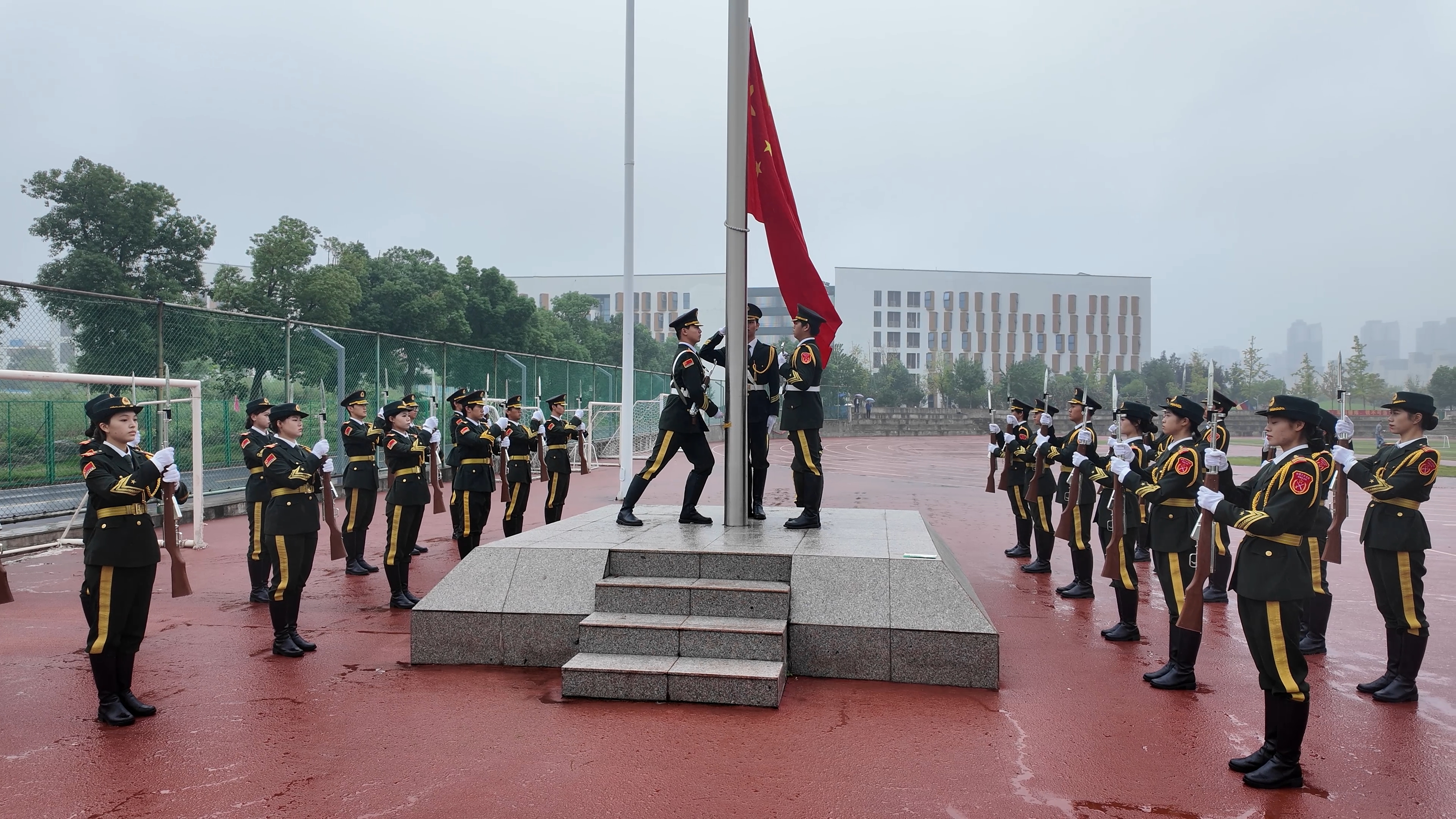 上午9时,大会在庄严的升旗仪式中拉开序幕。国旗护卫队迈着整齐步伐护送国旗通过主席台,激昂的国歌声响起,鲜艳的五星红旗冉冉升起,现场师生齐声高唱,气氛庄严热烈。