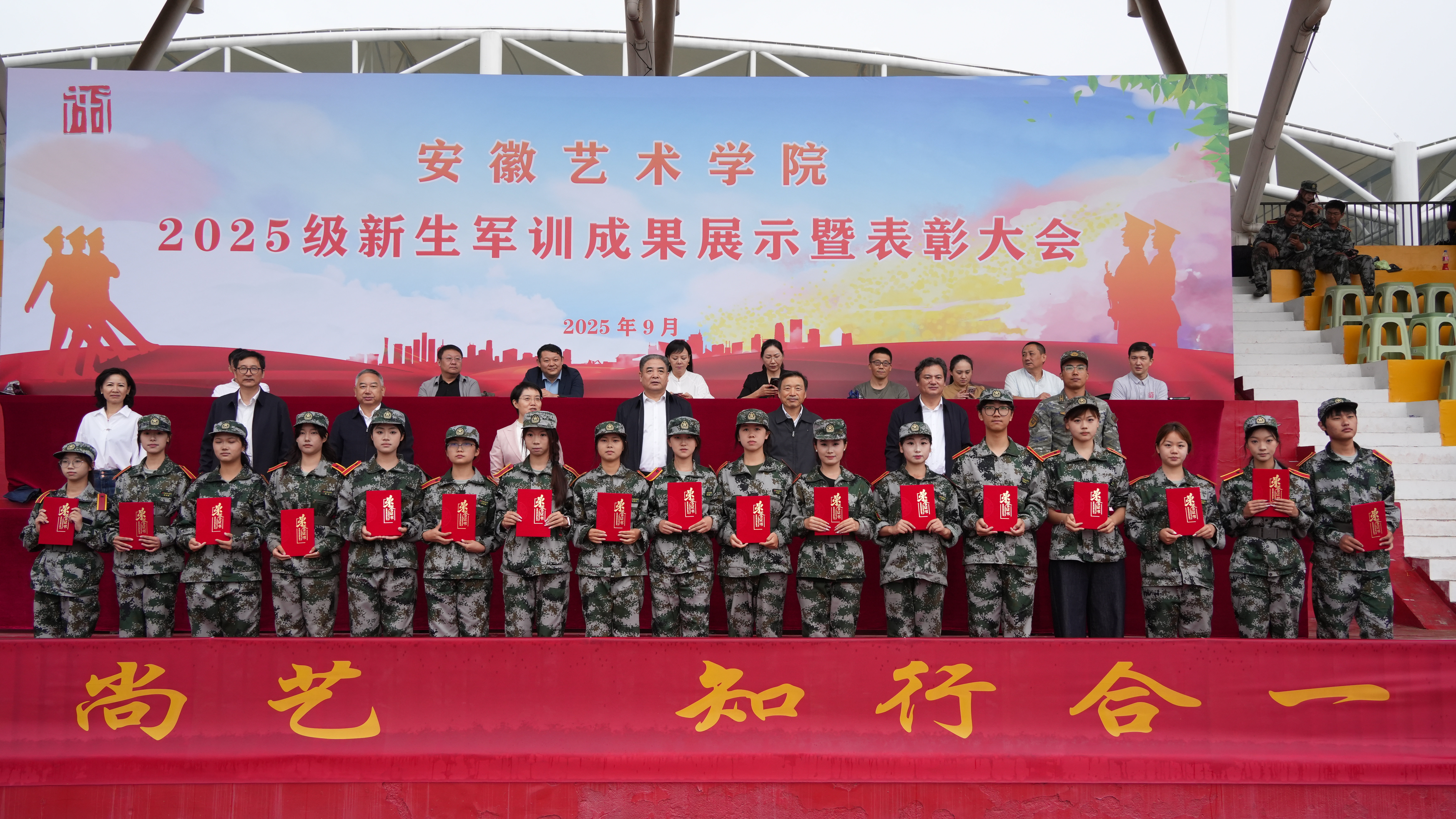9月29日上午,我校2025级新生军训成果展示暨表彰大会在校运动场举行。校党委书记韩军,党委副书记、校长柳友荣,党委副书记陈文兵,党委委员、副校长陈林,党委委员、纪委书记、监察专员程宗林,党委委员、副校长、教师工作部(人事处)部长(处长)曹晓富,党委委员、组织部部长王琍琍,承训部队首长张飞飞等出席大会。大会由韩军主持。