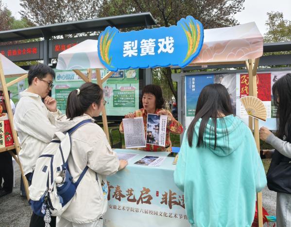 活动现场,各具特色的非遗项目令人目不暇接。传承人们带着匠心与故事,将安徽各地的文化精髓“搬”到了校园。在民俗技艺展区,渔梁鱼灯流光溢彩,传承人的舞动让人仿佛穿越到徽州古镇的热闹市集;金寨手绣针法细腻,绣出的花鸟栩栩如生;蚌埠草编、亳州木雕构思精巧,展现出民间智慧;庐州金饰光泽温润,传统錾刻工艺令人赞叹;池州喜拓前排起长队,师生们亲手压印吉祥纹样,体验传统技艺的魅力。