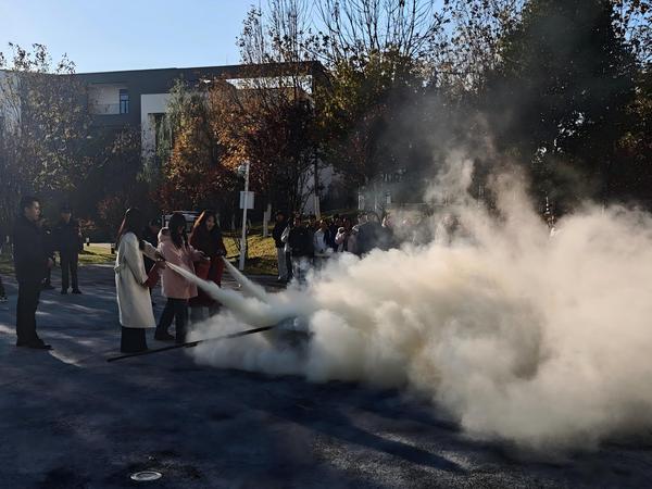 为检验培训成效,将理论知识转化为实际能力,培训结束后,全体参训人员在崇德楼前广场开展消防实操演练。韩曾现场示范灭火器操作流程,手把手指导大家掌握“一提、二拔、三握、四压”的关键要领,并组织参训人员分组进行实操练习,确保每个人都能规范、熟练使用灭火器材,切实提升应急处置实战能力。
