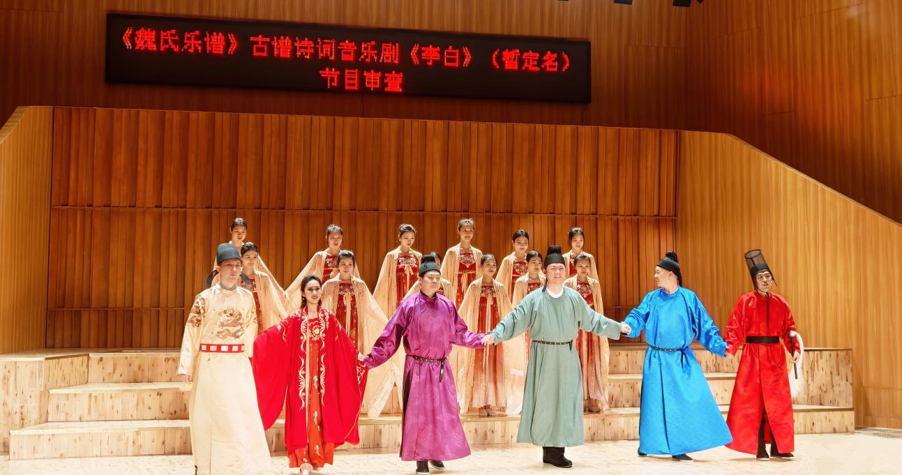 在节目审查环节,审查小组在校音乐厅观看了《李白》全剧的现场演绎。该剧由音乐学院、戏剧学院和舞蹈学院三方合力打造,运用“历史知情表演”理念与“艺术疗愈”思维,将音乐、戏剧、舞蹈、诗词文学进行了深度融合,形成兼具观赏性、美育价值与疗愈功能的特色文旅艺术产品,展现了学校跨学科合作的创作实力。