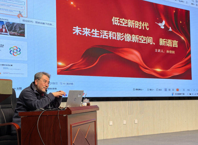 讲座中,孙曾田结合创作经历,分享了纪录片《最后的山神》、《黄河一日》等创作的幕后故事,诠释了“创作不仅是既有经验的分享,更重要的是对未来的展望和实验”。讲座中,孙曾田还解读了低空经济带来的空间革命和影视视角革新、以及AI技术的趋势,鼓励学生“夯实文本创作与艺术想象能力,主动抢占新领域‘处女地’”。